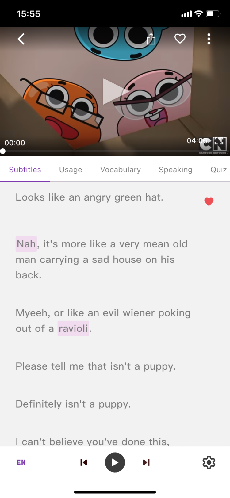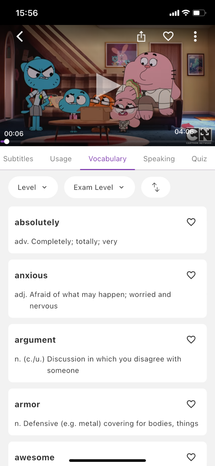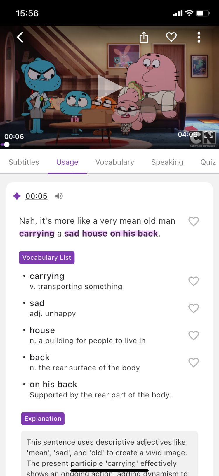 Switch subtitles, usage, and vocabulary list in the learning mode area (below the video) to study from different angles!