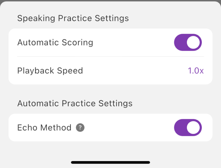 Auto-Scoring: When enabled, scoring occurs automatically after recording. If disabled, you must tap "Analyze Pronunciation" after recording.
