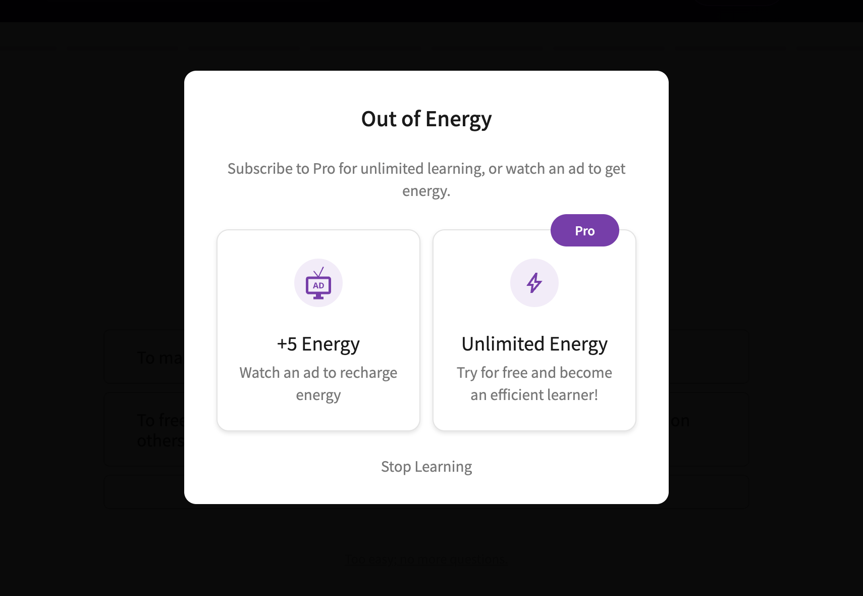 - Unlimited Energy: Your learning process is entirely free from Energy restrictions, allowing unobstructed access to all features.