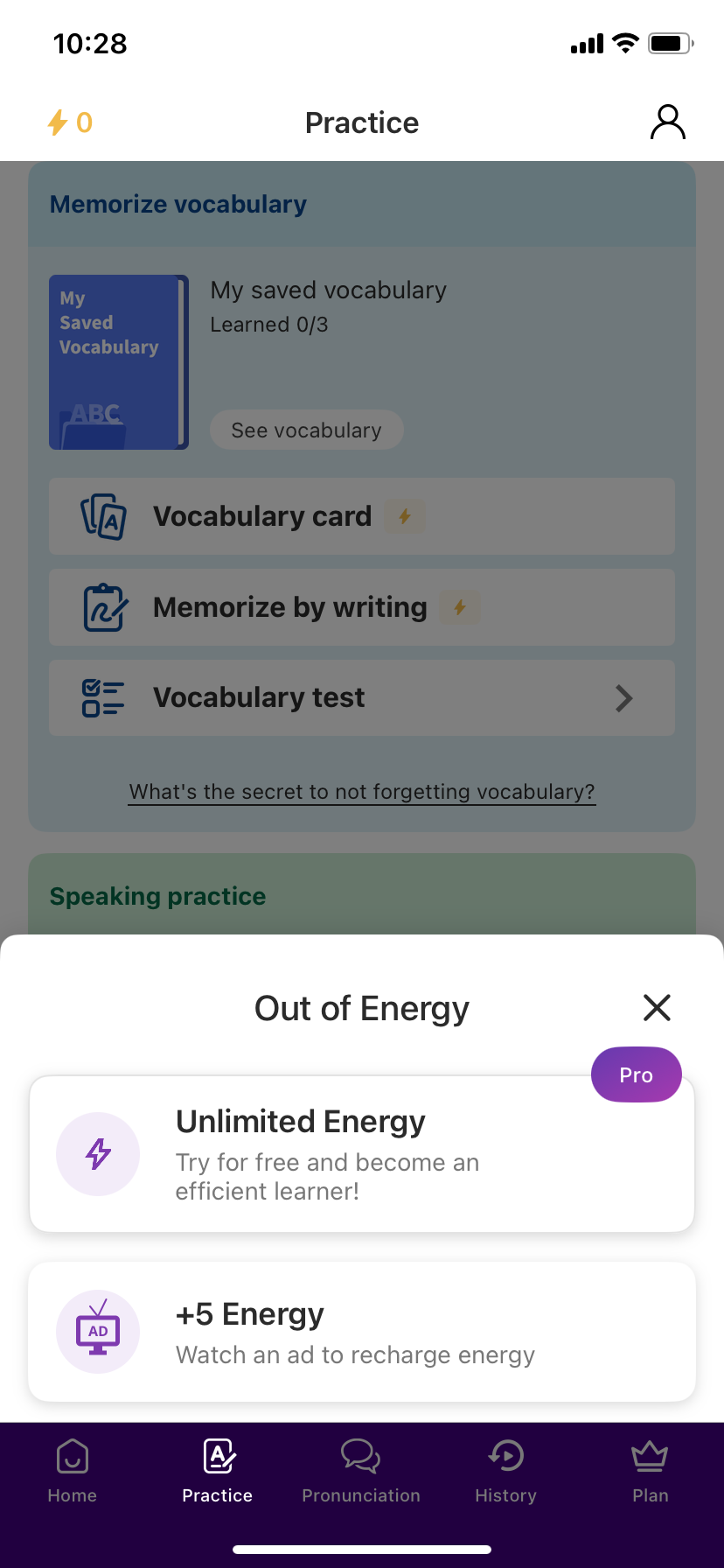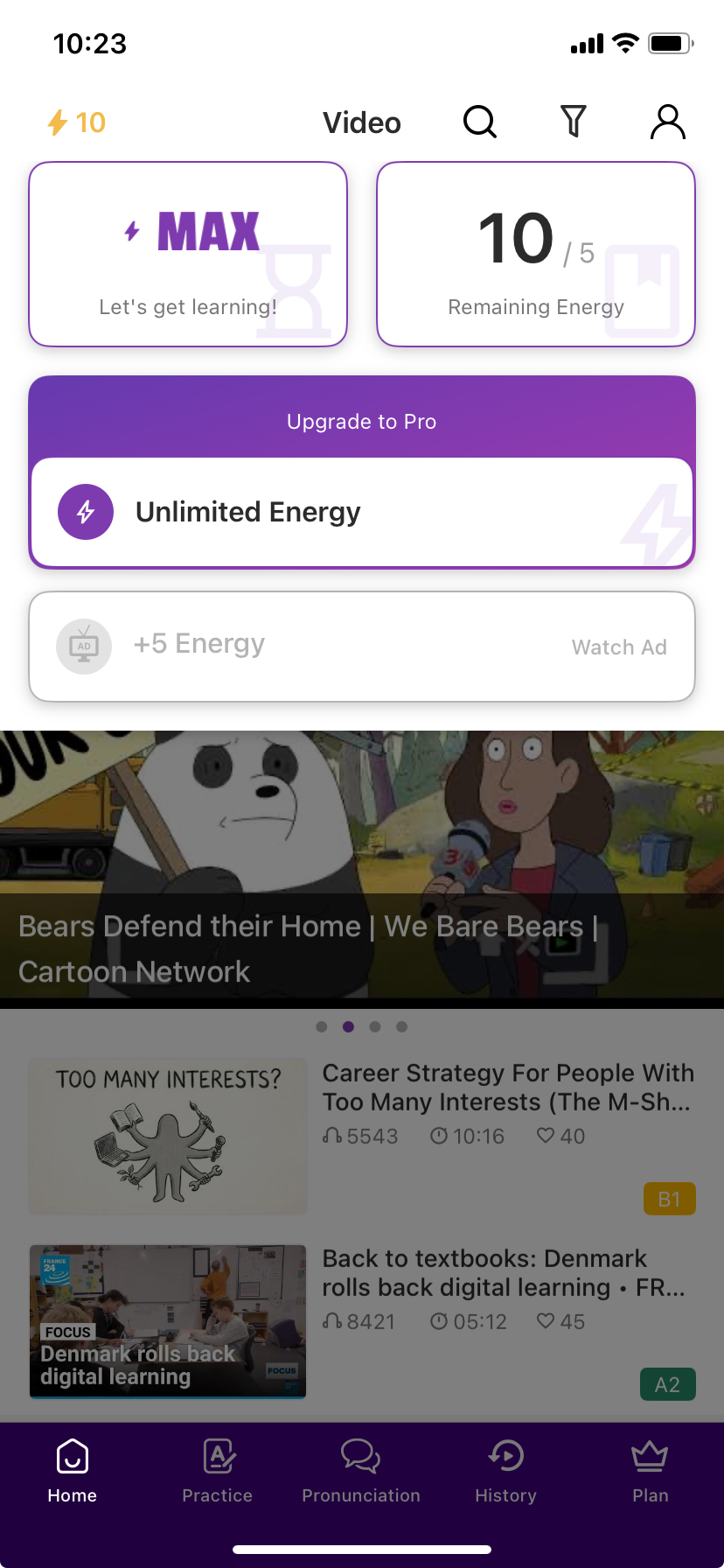 "Energy" is a universal resource used by free members on VoiceTube. It helps you unlock premium features, conduct intensive practice, and enjoy an unobstructed learning experience.