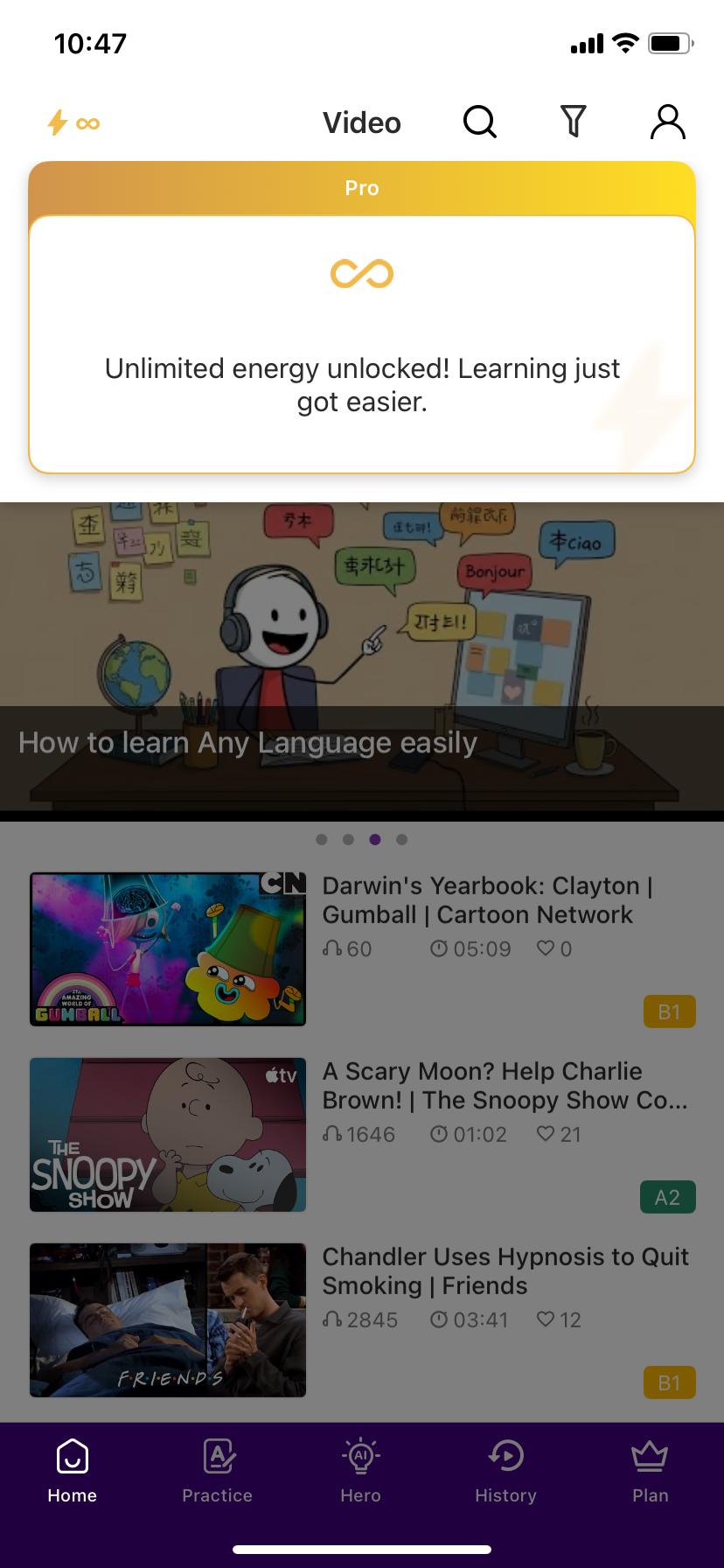 When you successfully consume Energy to unlock a feature (such as complete subtitles) or replenish Energy (by watching an ad), the system will provide clear success feedback notifications.
