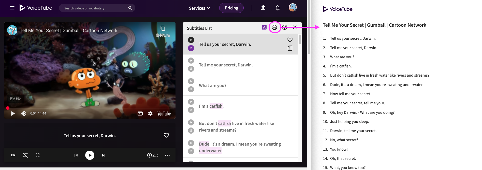 Or use the "Print Subtitles" function on the web version of VoiceTube to print out the entire subtitle file for detailed reading.