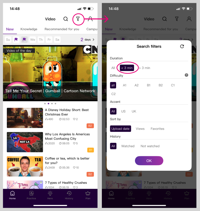 On the VoiceTube App, you can find videos you like in the Home Editor's Picks, Hot Tags, various Themed Channels, or by using Search!