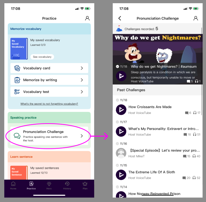If you don't know what to practice, you can follow the "Daily Sentence" in the "Daily Speaking Challenge"!
