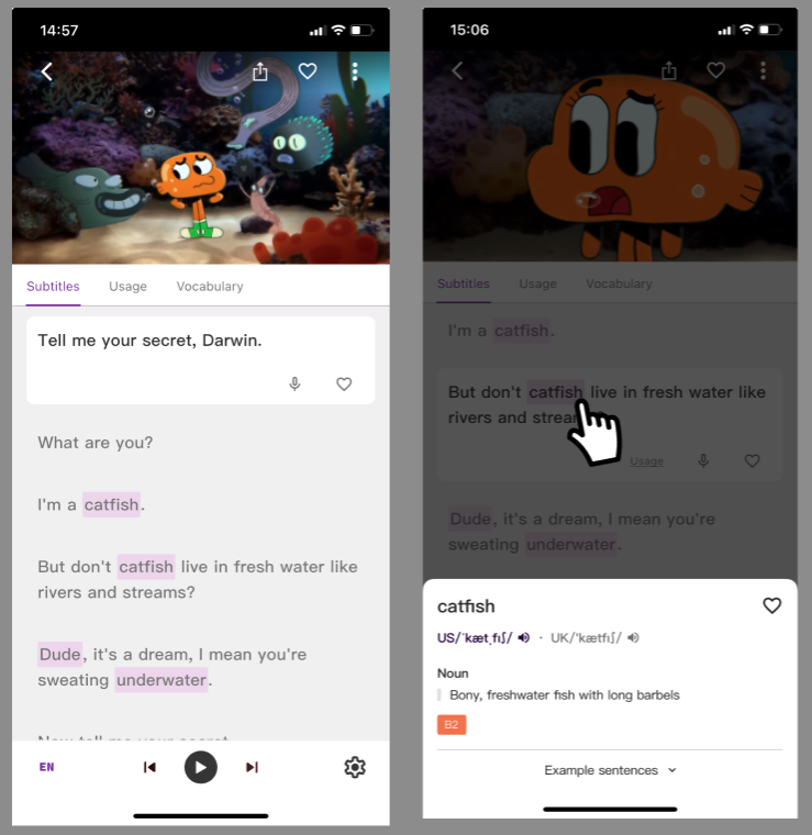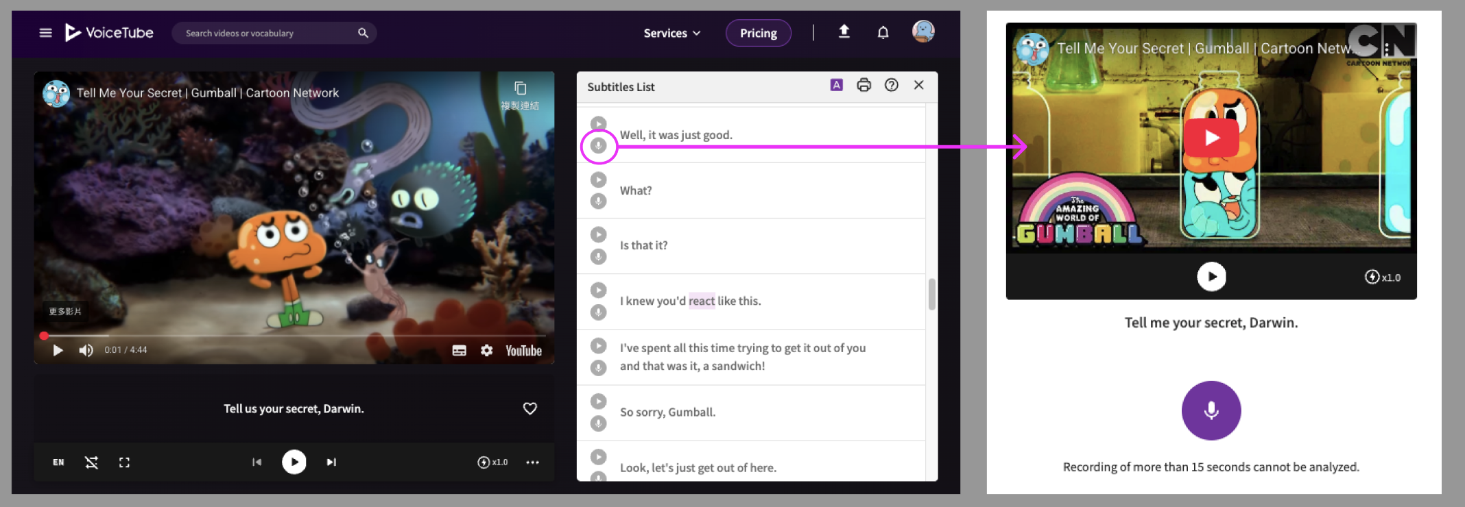 Every subtitle sentence has a "🎙️" icon, allowing you to focus on practicing that specific subtitle.