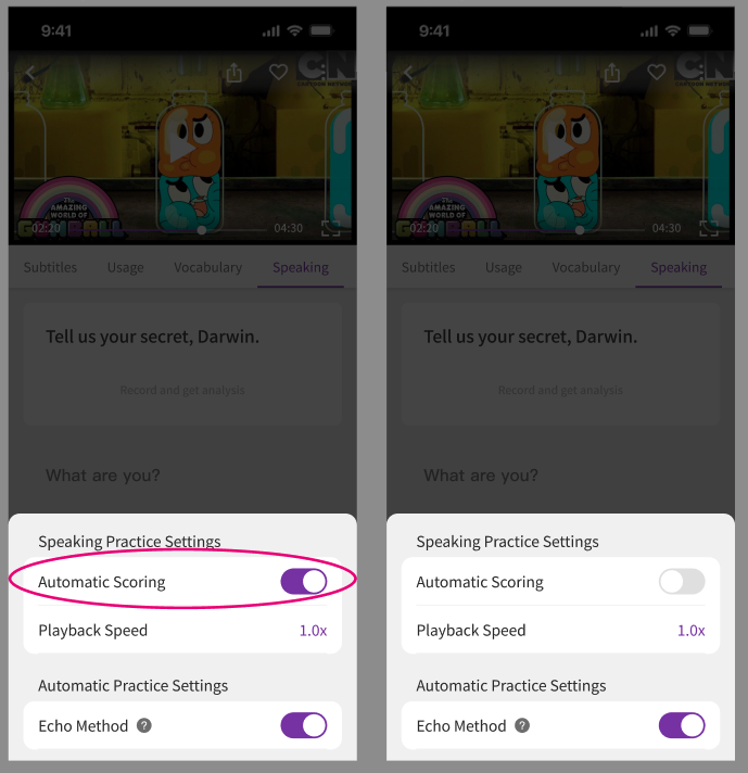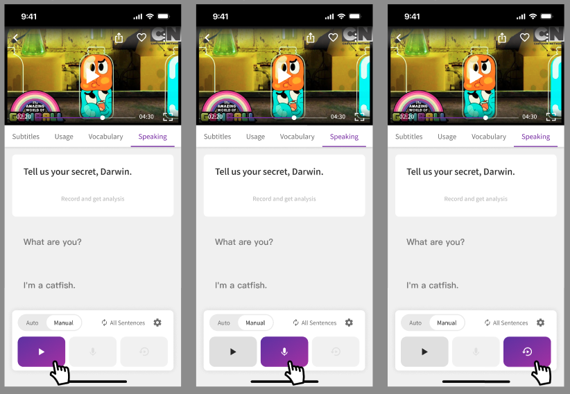In the APP, you can switch between "Manual" or "Auto" speaking practice modes.
