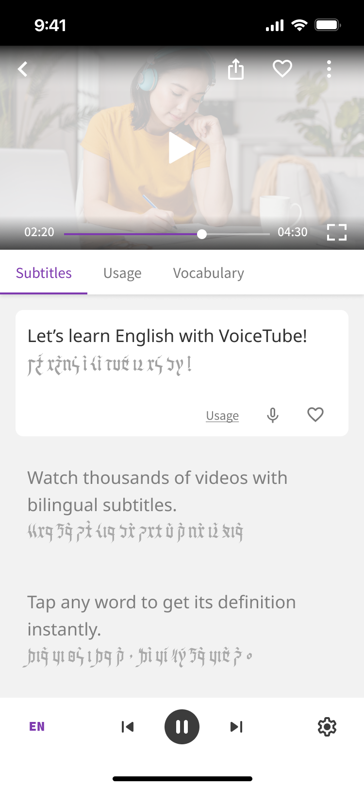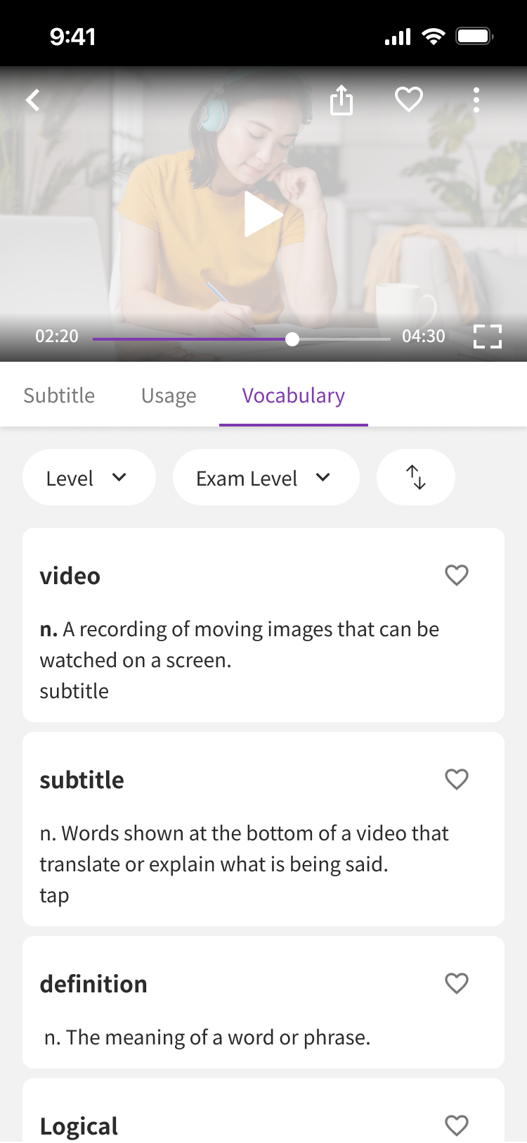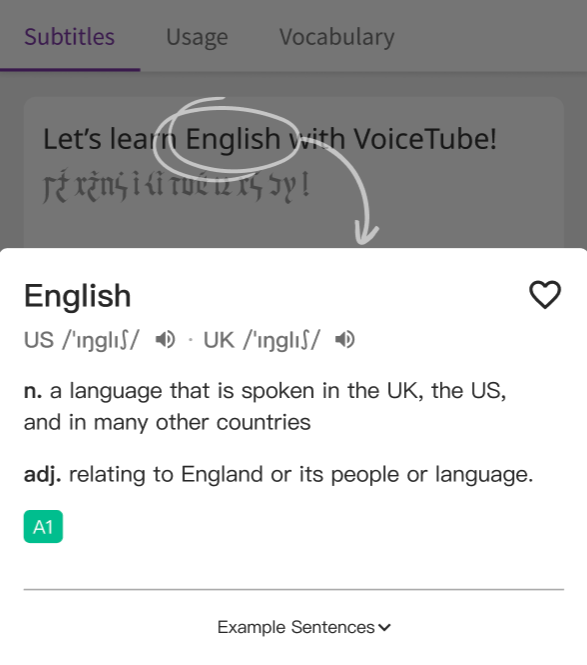 - 単語ハイライト:単語の難易度や種類をフィルタリングし、字幕内に紫のマーカーでハイライトされます。