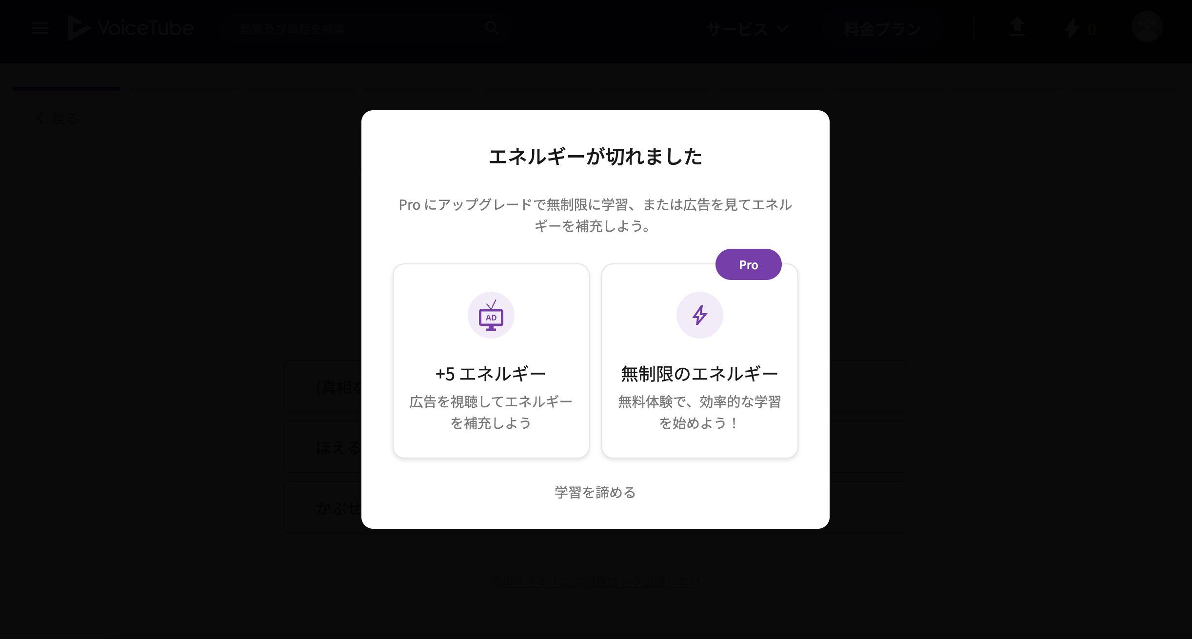「エネルギー」は、無料会員がVoiceTubeで利用できる共通リソースです。有料機能のロック解除、深い練習、そして妨げのない学習プロセスを楽しむのに役立ちます。