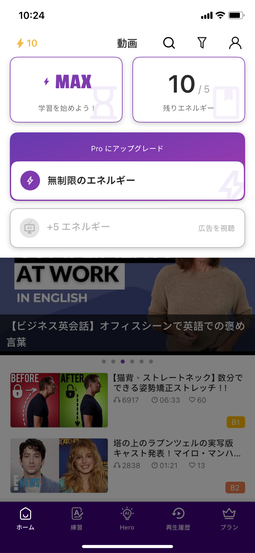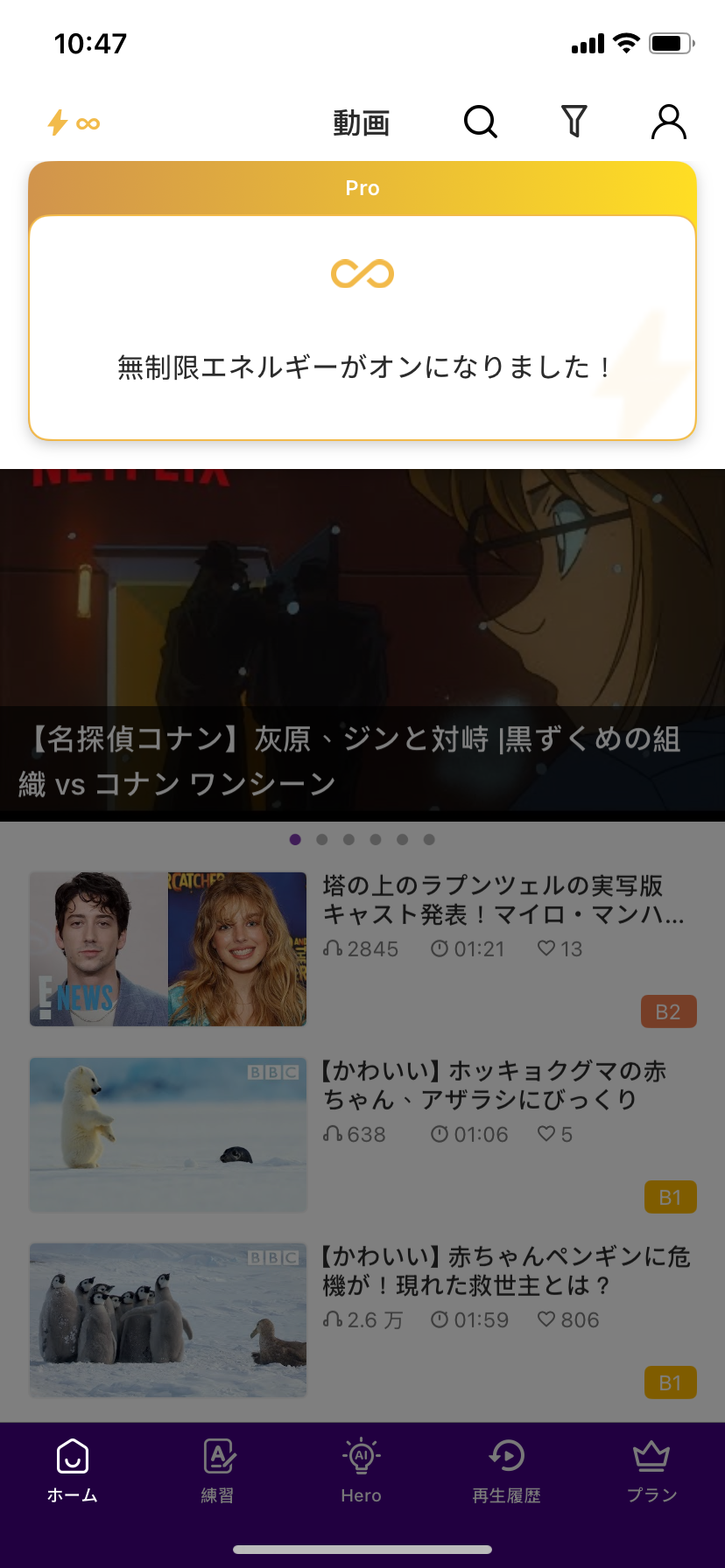 エネルギーを消費して機能のロック解除(例:完全な字幕)に成功した、またはエネルギーを補充(広告視聴)した際、システムは明確な成功フィードバックのヒントを提供します