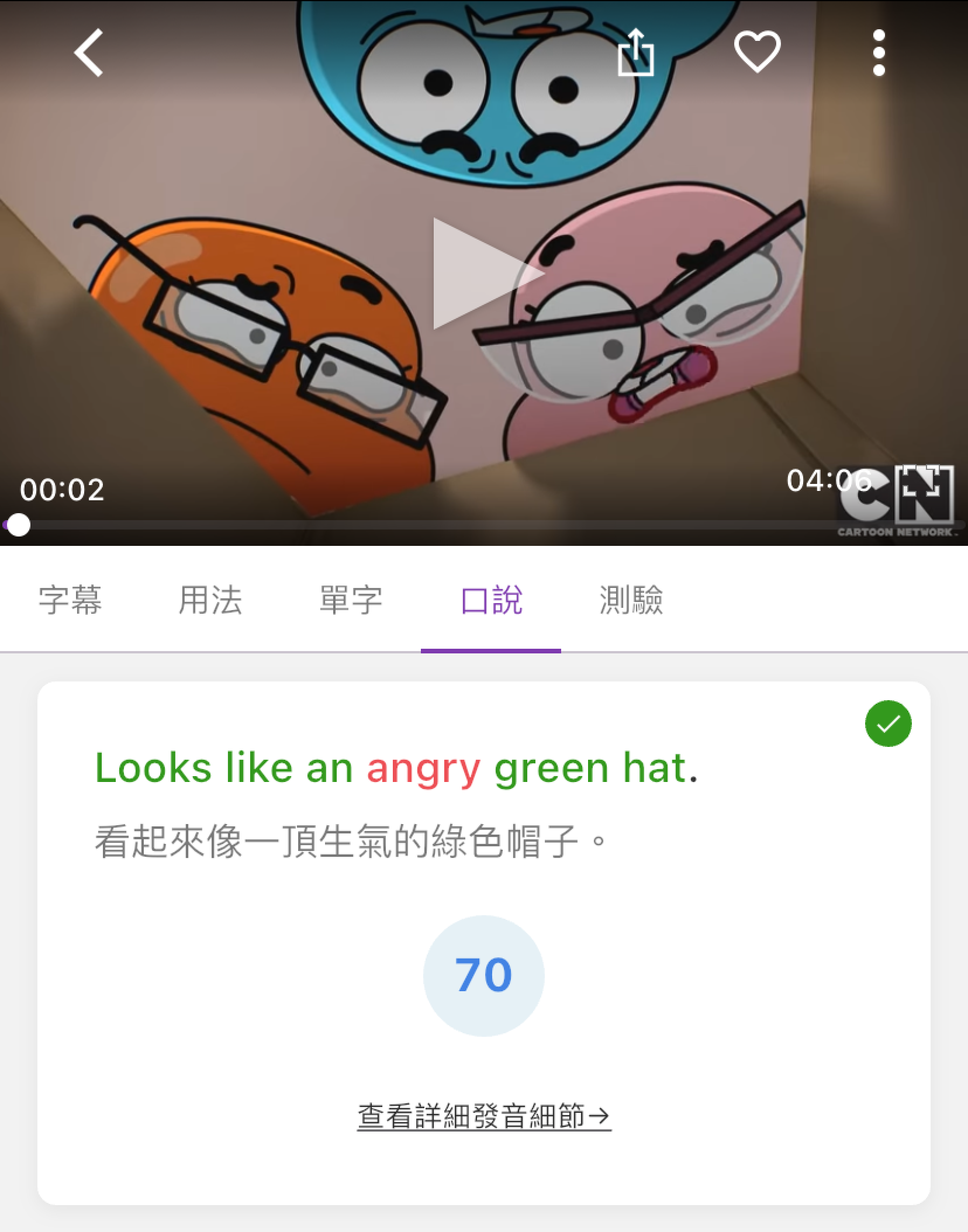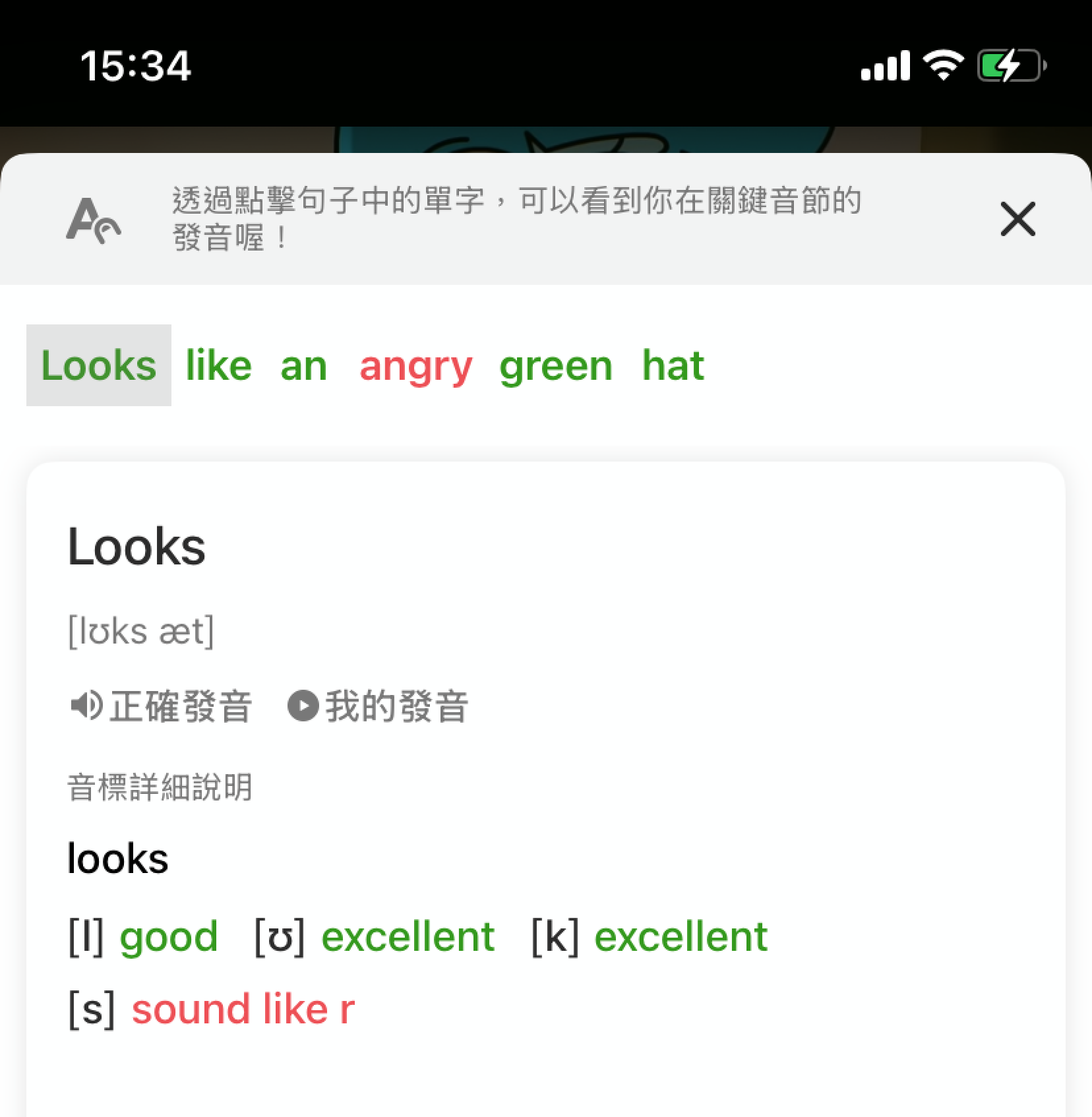 | AI 發音分析與評分 完成口說錄音後,系統會即時針對你的發音進行人工智慧分析,幫助你掌握發音的準確度。 - 文字顏色標示: