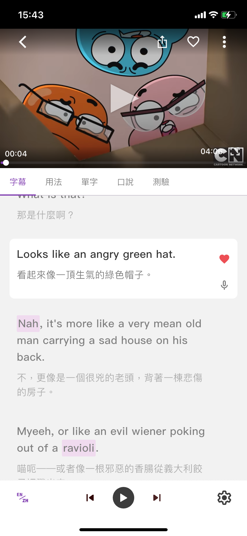- 單字標示:可篩選單字難易度、種類,會以紫色螢光筆的樣式顯示在字幕中。