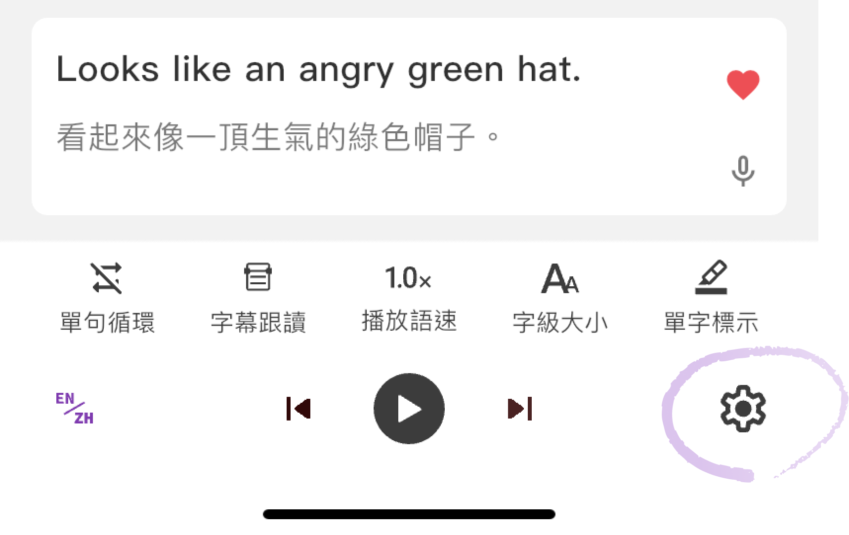錄音 收藏此字幕 調整更多字幕、播放設定- 單句循環