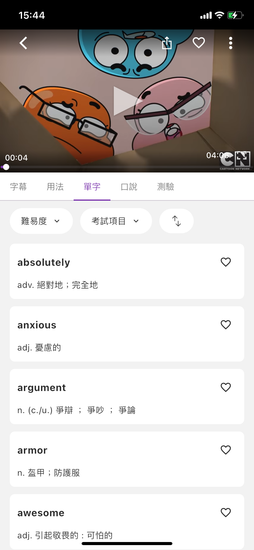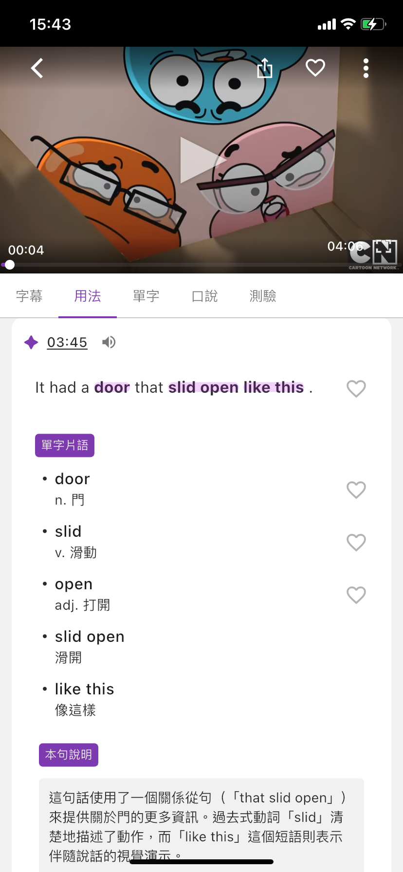 | - 所有你收藏過的影片、單字和單句,都完整地保存在收藏區囉!隨時回來重溫影片,或透過單字卡和練習題來複習,讓學習效果更加倍!