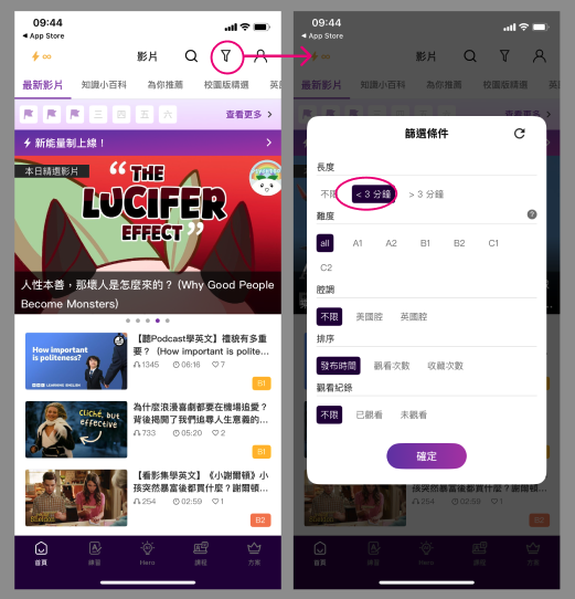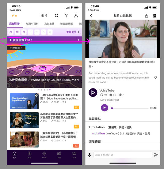 在 VoiceTube App 上,你可以在首頁精選項目、熱門標籤、各式主題頻道或是使用搜尋,找到你喜歡的影片!