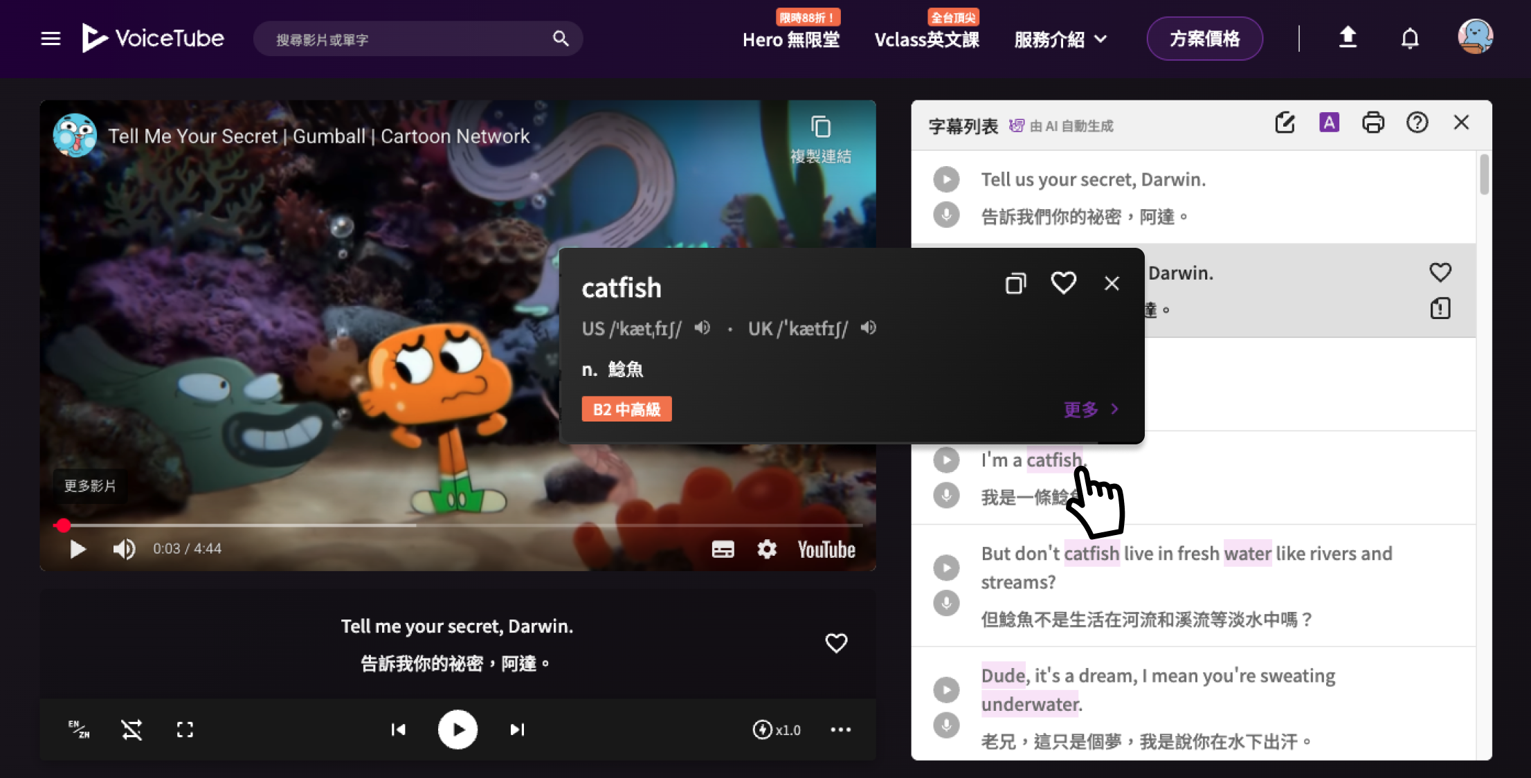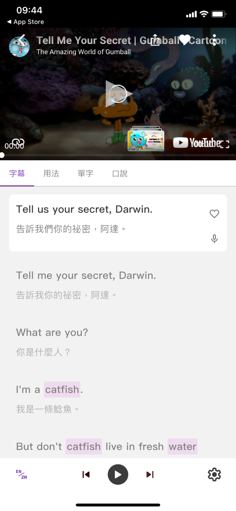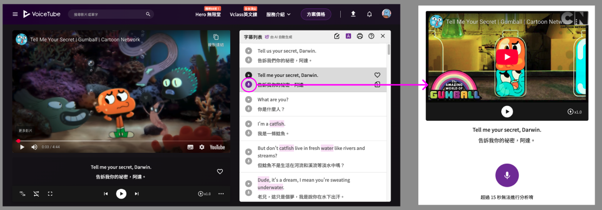 每個字幕句子都有一個「🎙️」icon ,讓你可以專注於練習單一字幕。