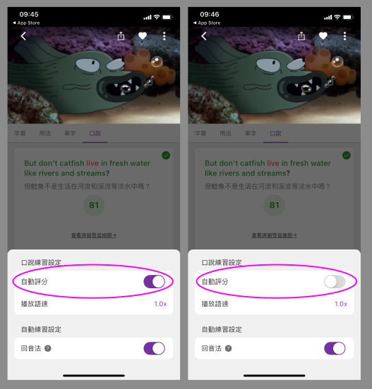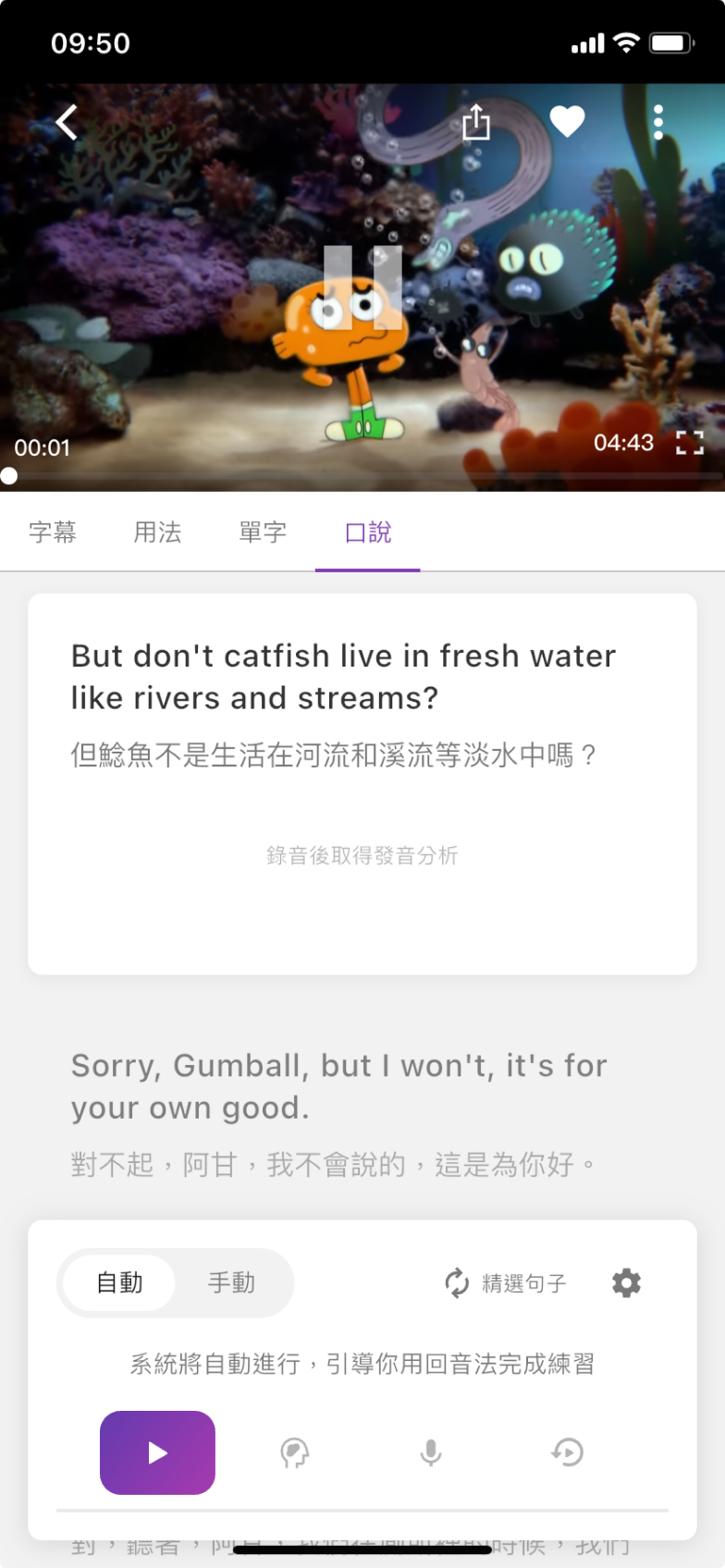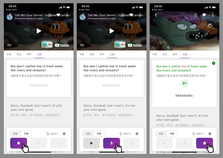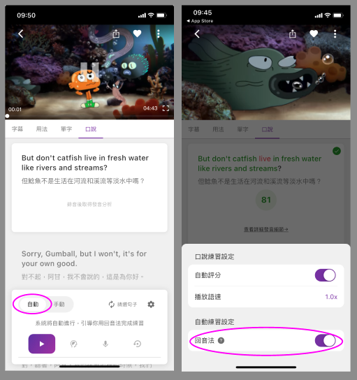 在APP中,你可以切換成「手動」或「自動」口說練習模式。