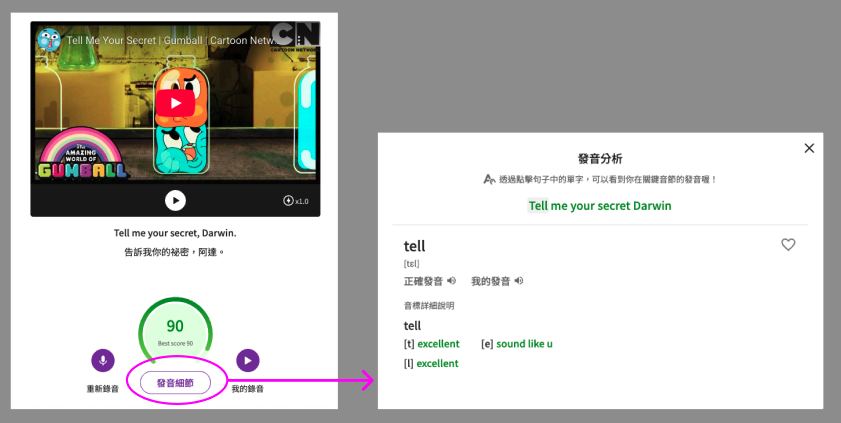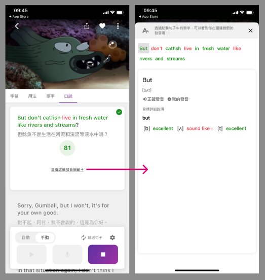 不確定自己唸的跟原本差多少嗎?可以使用「發音分析」功能來確認喔!