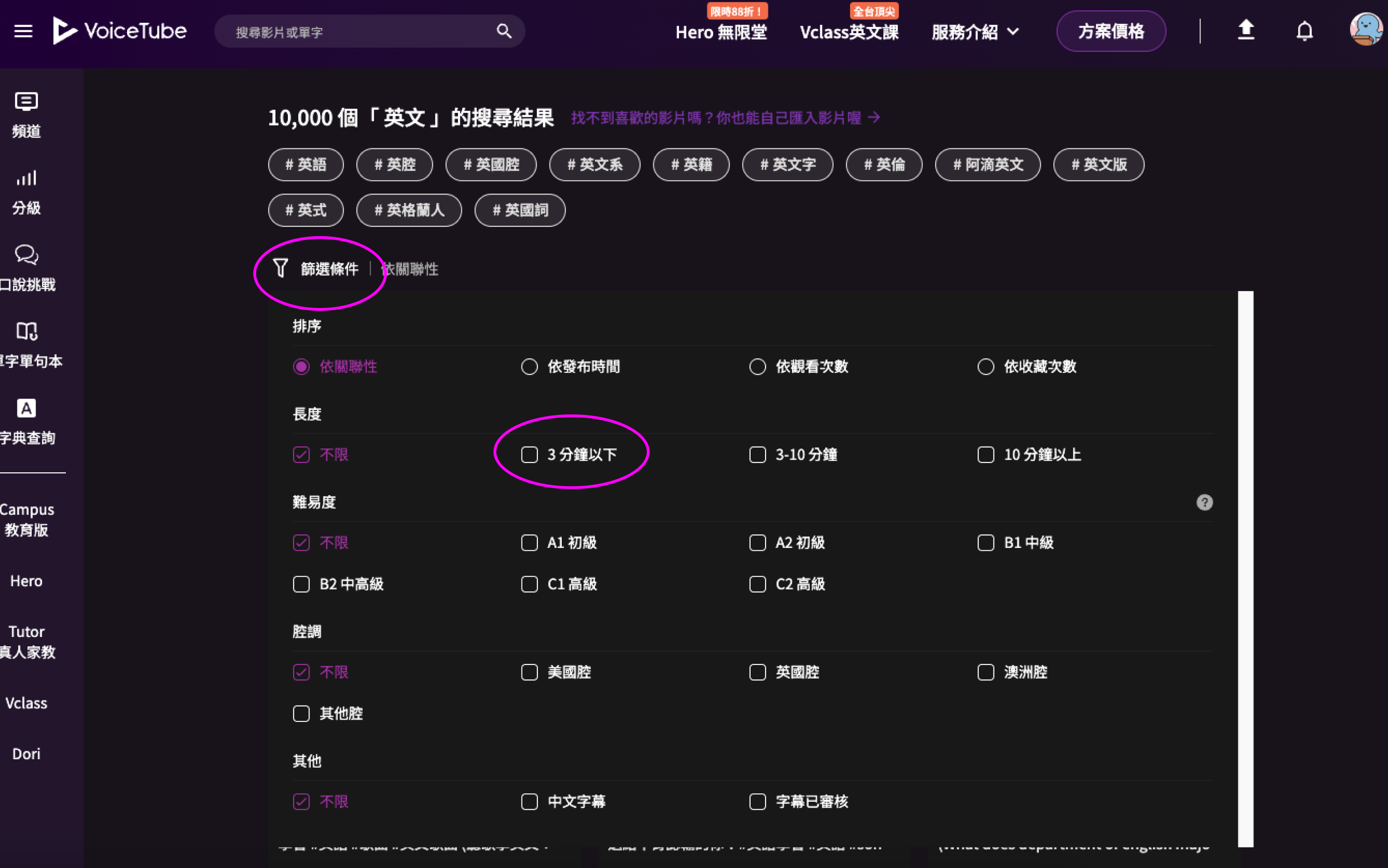 可以使用篩選功能,選擇 3 分鐘以下的影片。