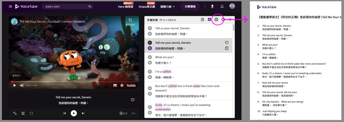 也可以在網頁版的 VoiceTube 使用「列印字幕」的功能,把整份字幕檔印出來細細閱讀。